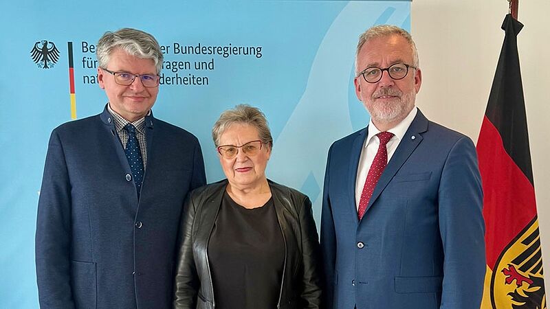 Der Beauftragte der Bundesregierung für Aussiedlerfragen und nationale Minderheiten, Dr. Bernd Fabritius, hat sich am 4. März mit der Vorsitzenden des Trägervereins Siebenbürgisches Museum Gundelsheim e.V., Dr. Irmgard Sedler, zu einem ausführlichen Gespräch im Bundesministerium des Innern getroffen. Begleitet wurde der Termin von Dr. Dr. Gerald Volkmer, dem stellvertretenden Direktor des Bundesinstituts für Kultur und Geschichte der Deutschen im östlichen Europa (BKGE).