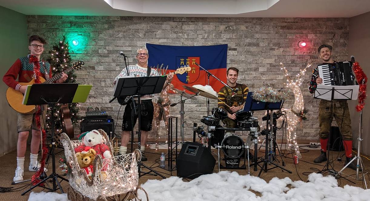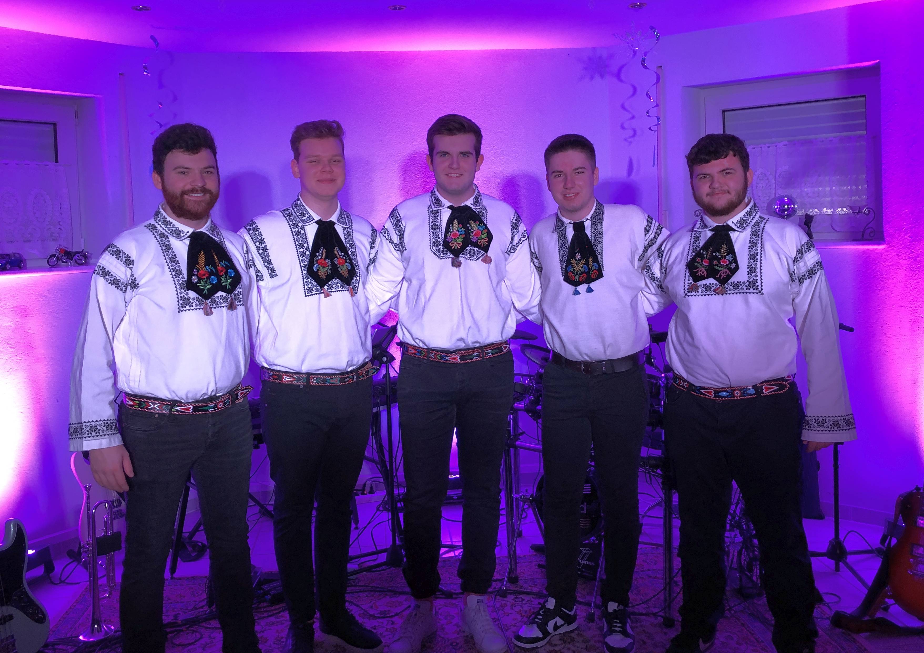 Zum diesjährigen Online-Heimattag haben sich fünf „stottlich Kniacht“ zusammengefunden, um als „Böblinger Combo“ ihre Premiere zu feiern. Die Band, bestehend aus Tim Schmidt (Gitarre, Trompete), Marco Dick (Gitarre, Akkordeon, Steirische), Jan Elst (Schlagzeug, Gitarre), Samuel Krafft (Keyboard, Bariton) und Wolfgang Krafft (E-Bass, Posaune), heizt die Stimmung mit ihrer jugendlichen Leichtigkeit an. Ihr Repertoire zieht sich von klassischem über modernen Schlager bis hin zu herrlich klingender Blasmusik. Der Erhalt der sächsischen Tradition ist ihnen sehr wichtig, so haben sie über die Böblinger Jugendtanzgruppe Bekanntschaft geschlossen. Ihre musikalische Leidenschaft verbindet die jungen Burschen, also genießt und feiert mit der „Böblinger Combo“ ihren ersten Auftritt.