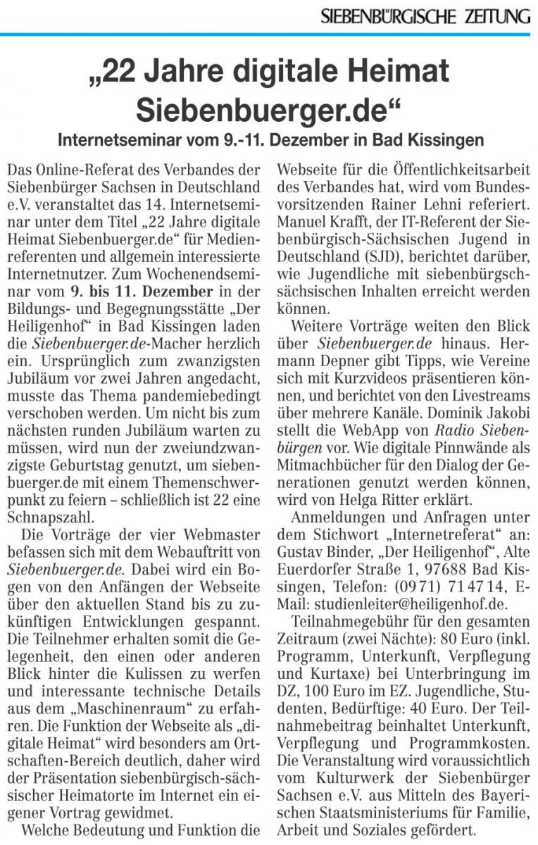 Die Ankündingung und Einladung zum Internetseminar in der Siebenbürgischen Zeitung: