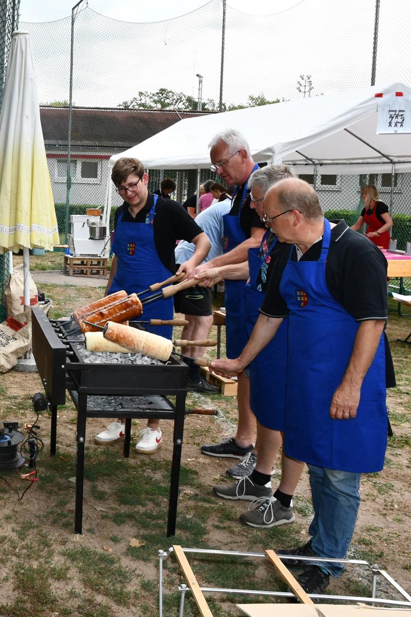Am Sonntag, dem 21. August, fand das Waldfest des Landesverbandes Hessen traditionell auf dem Hammerwurfplatz in Neu-Isenburg statt. Alles war bestens geplant und vorbereitet. Pünktlich um 8.30 Uhr trafen sich die Helfer auf dem Parkplatz vor dem Zugang zum Ort des Geschehens mit Tischen und Bänken, Grills und all den anderen Sachen, die man bei einem Waldfest so braucht, um auf das Gelände zu fahren. Doch das ging leider nicht, weil sich die Absperrpfosten nicht entriegeln ließen. Erst nach einer halben Stunde Wartezeit war das Problem gelöst und es konnte losgehen.Die Baumstriezelbäcker stellten an ihrem ausladenden Arbeitsplatz Tische, Gerätschaften und die Feuerstelle auf, das Grillteam baute seine Stände auf, die vorgekühlten Kisten mit allerlei erfrischenden Inhalten wurden im Getränkewagen deponiert. Zum Schutz gegen die Sonnenbestrahlung wurden zwei große Zelte aufgebaut sowie Bänke und Tische.