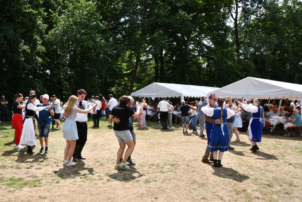 Am frühen Nachmittag zeigten dann die Siebenbürgischen Tanzgruppen Mittelhessen und Pfungstadt mehrere Tänze. Sie schafften es, trotz unebenem, staubigem Boden, die Zuschauer zu begeistern und bei ihrer Zugabe, der Sternpolka, sogar ehemalige Tänzer unter den Zuschauern zum Mittanzen zu motivieren.