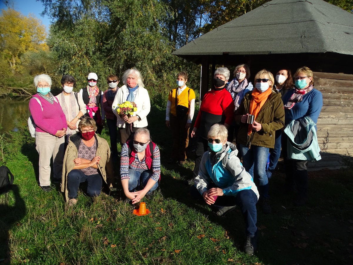 Hat der Name dieser Flusslandschaft etwas mit Kühen zu tun? Mitnichten. „Küh“ soll eine Verballhornung des Wortes „künic“, König, sein. Mit Kopf oder Wörth wie in der Bezeichnung Schlappes Wörth oder Karls Wörth, wird das Festland bezeichnet, welches in der Aue aus dem Wasser herausragt. An der Aussichtshütte Schlappes Wörth angekommen, konnten wir uns ein Bild von diesem Abschnitt des Altrheins machen; ein ruhiges Wasser an dessen Ufern Gräser und Röhricht wuchs. Danach wanderten wir aus dem Weichholzwald hinaus durch die noch grünen Wiesen, welche von Apfelbäumen gesäumt waren. Spaziergänger, Wanderer und Radfahrer kreuzten unsere Wege oder überholten unsere Gruppe. Familien picknickten im Gras. Nach dreieinhalb Stunden, vergangen wie im Flug, näherten wir uns dem Parkplatz und stellten fest, dass wir einen Rundweg gegangen sind. Da die Schutzhütte am Ufer des Rheins wenig einladend wirkte, stärkten wir uns mit Kaffee, Tee, Brezeln und Kuchen in der wärmenden Sonne stehend.