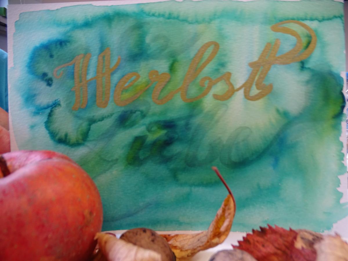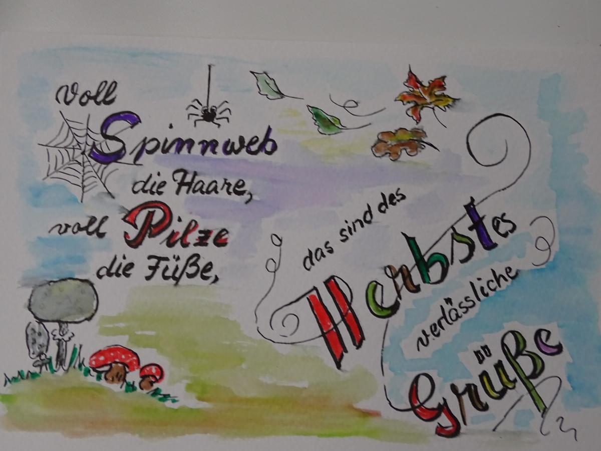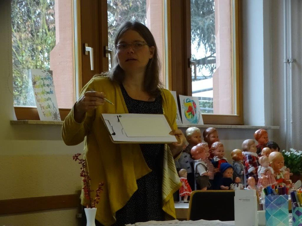 Gut gestärkt ging es dann zum kreativen Teil des Tages über. Die Künstlerin Anita Scheiner führte uns in die Kunst des Handletterings ein. Herbstliche Grußworte und Sprüche wurden mit Schmuckbuchstaben und bestimmten Stiften, sog. Brushpens, auf schönem Papier kunstvoll gestaltet. Alle Frauen konnten sich somit eine selbst gestaltete herbstliche Karte mitnehmen.