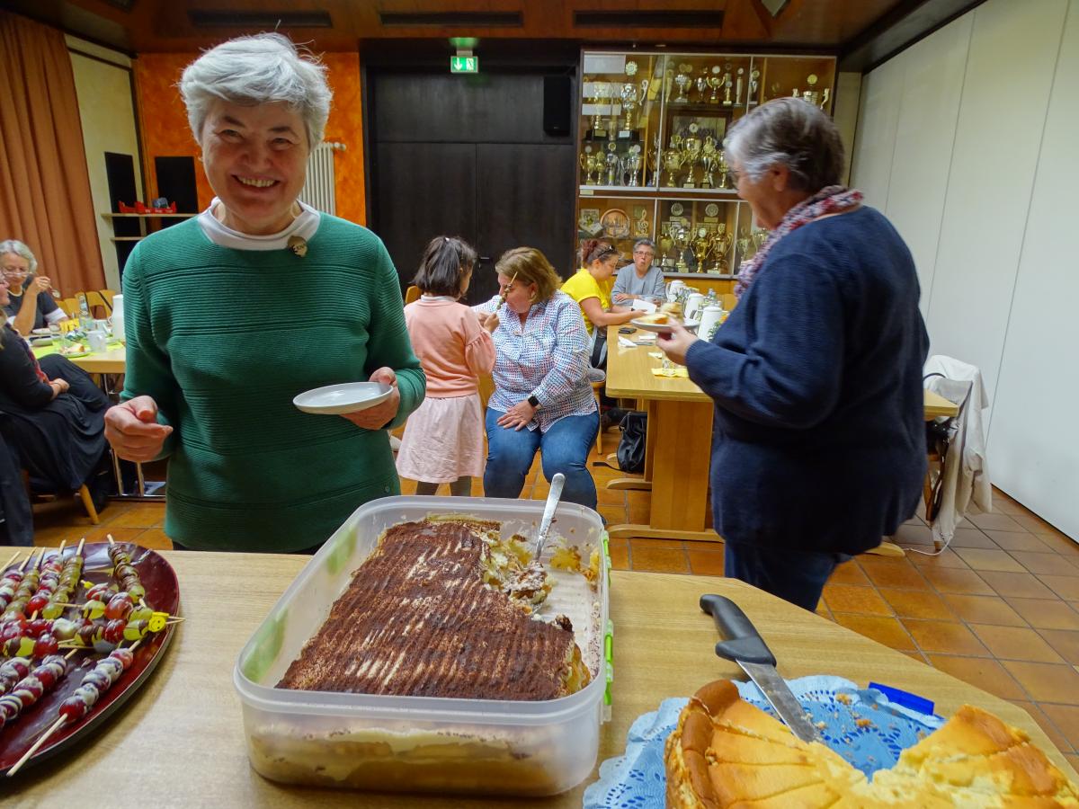 Zum Mittagessen überraschten uns Karin Scheiner mit einer vegetarischen grünen Bohnensuppe und dem Nachtisch Trifle und Gertrud Istvan mit Brodalawend. Zubereitet wurden die Gerichte nach Rezepten aus dem Buch von Dagmar Dusil „Blick zurück durchs Küchenfenster“. Sie schmeckten nach Kindheit.
