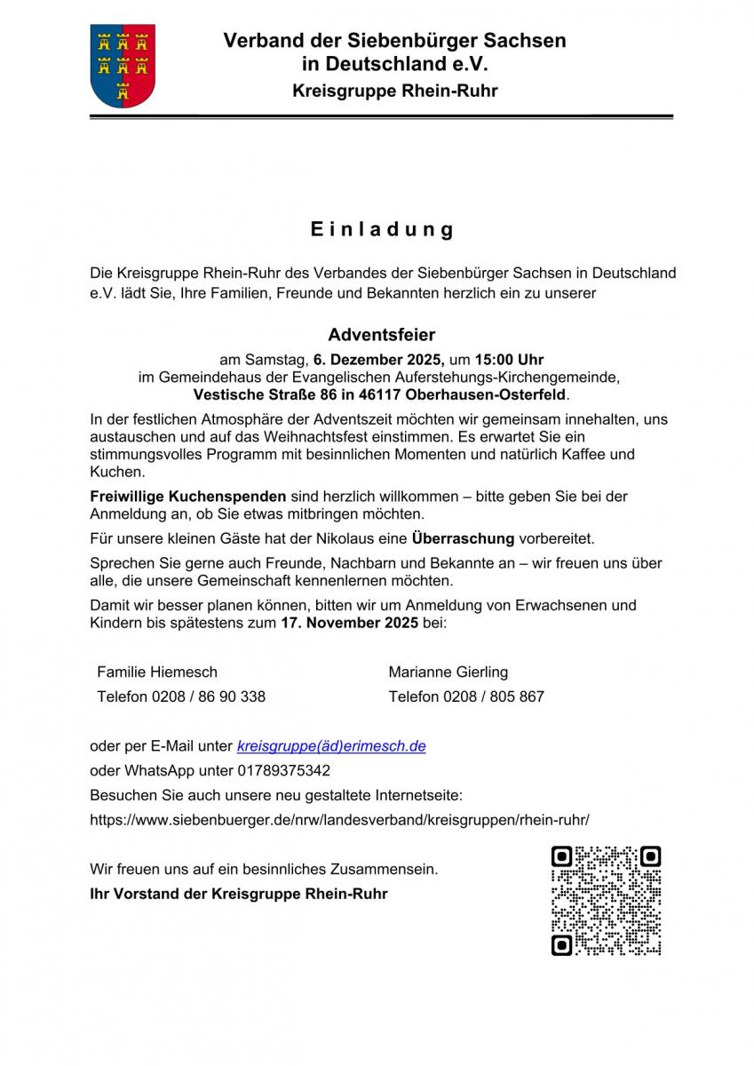 Am 30. August 2015 wurde in einer Mitgliederversammlung die Kreisgruppe Rhein-Ruhr gegründet.Vereint wurden dabei die bisherigen Kreisgruppen Duisburg-Essen-Mülheim und Oberhausen einschließlich dem Niederrhein. Hintergrund dieses Zusammenschlusses waren sowohl sinkende Mitgliederzahlen als auch mangelnde Aktivitäten.Im Bereich der ehemaligen Kreisgruppe Oberhausen hat die Siedlung „Freitagsfeld“ im Bereich des Ortsteiles Osterfeld (benannt nach einem gleichnamigen Bauern und seinem weitläufigen Hof), als eine der ersten Siedlungen der Siebenbürger Sachsen in Deutschland eine große Rolle gespielt. In dieser Bergarbeitersiedlung auf dem „Freitagsfeld“ wurden Straßen nach Städten in Siebenbürgen benannt, an den Häusergiebeln waren große Bilder mit Paaren in siegenbürgischen Trachten angebracht. Es gab eine eigene Blaskapelle, einen Chor, eine Volkstanzgruppe und einen Frauenverein.