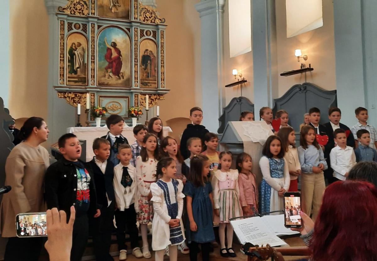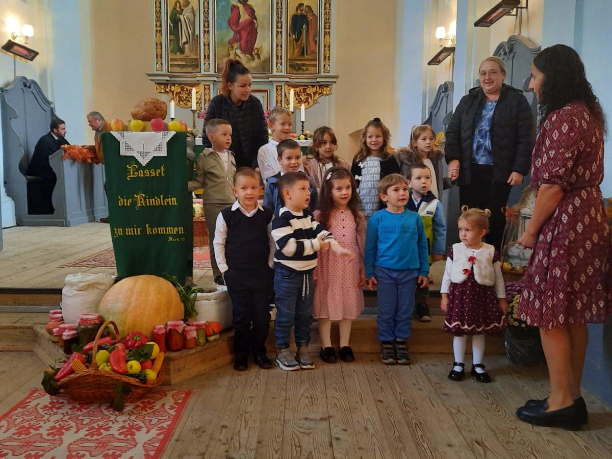 Nach der Sommerpause bot das Erntedankfest die nächste Gelegenheit, um in größerem Rahmen Gottesdienst zu feiern An diesem Fest nahmen auch die Kinder aus dem Kindergarten und die Schüler der Klassen 0-4 teil, begleitet von ihren Eltern und den Erzieherinnen und Lehrerinnen, die mit den Kindern eine musikalische Einlage boten und so dem Dankgottesdienst eine frische Note verliehen. Anschließend wurde im Gemeinderaum bei Speis (Mici) und Trank zusammengesessen. Die Ernteerzeugnisse aus der Kirche wurden an Bedürftige verteilt.
