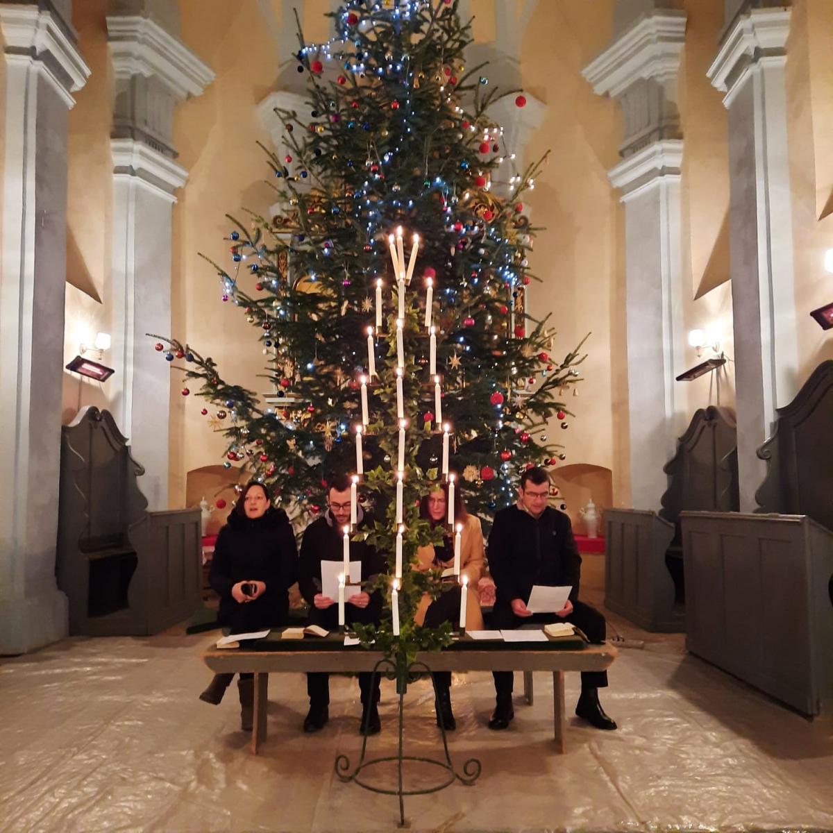Das Schmücken der schönen Tanne, auch diesmal von Familie Lutsch gespendet, war eine Herausforderung und Höhenangst oder Schwindel durften die fleißigen Helfer nicht haben. Der Tannenbaum und das Krippenspiel und am Morgen das Leuchtersingen, das Puer Natus und Stille Nacht von der Blasmusik gespielt, haben die Weihnachstimmung vollendet. Bei Kuchen, Glühwein und Tee konnte man am Heiligabend noch gemütlich miteinander plaudern.
