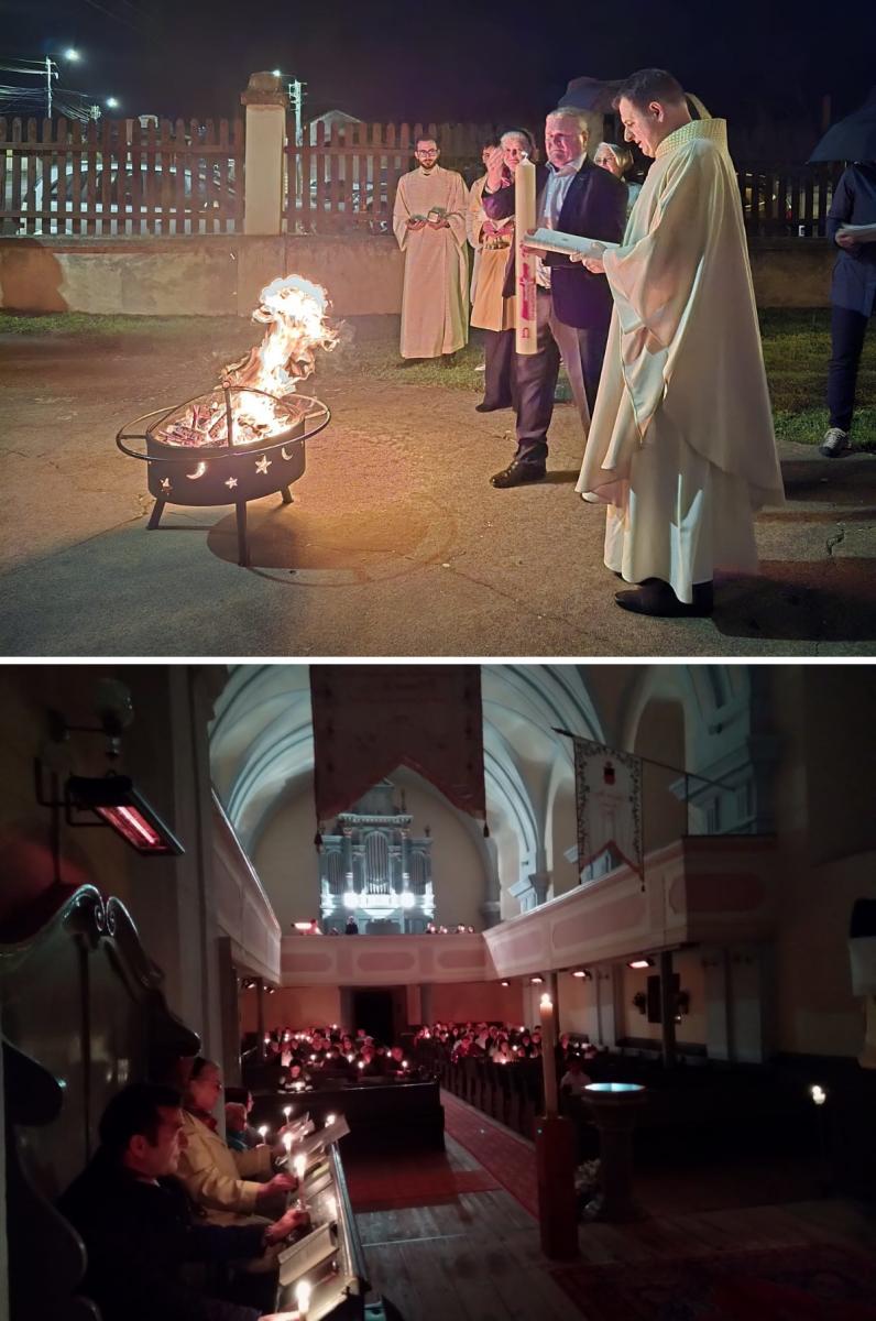 Wie im Vorjahr wurde ein Osternachtgottesdienst von Pfarrer Denis Arion zelebriert, unterstützt von Andreas Klett. Symbolträchtig und beeindruckend wurde auf die folgenden Feiertage hingewiesen.