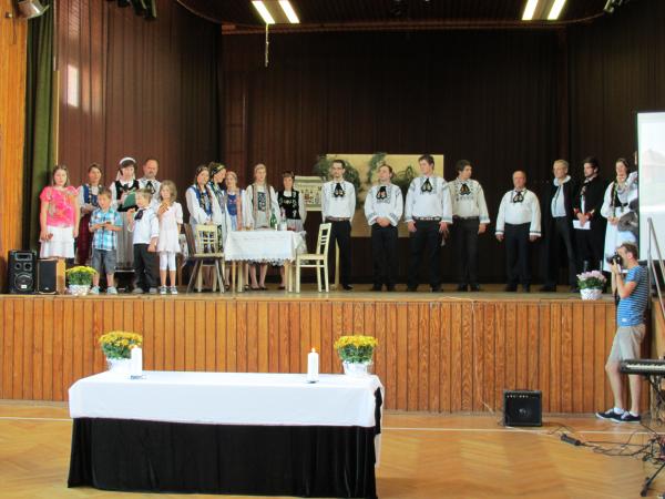 Nachdem wir den selbst gebackenen Kuchen genossen hatten (nochmals herzlichen Dank an die Spenderinnen), gab es einen kulturellen Beitrag: unter der Leitung von Tidi Hügel jun. führten uns die Jugendlichen zusammen mit einigen Erwachsenen ein Theaterstück auf. Ein Schmaus für die Augen war, dass alle die Probstdorfer Tracht trugen und ein Schmaus für die Ohren, dass alle sächsisch sprachen. Sie stellten uns im Rahmen des Stückes Bräuche aus Probstdorf vor, wie beispielsweise das Überbringen einer Nachricht unter Weitergabe des Nachbarschaftszeichens, die Verteilung von Lebkuchenhasen an Ostern durch den Pfarrer und das Kuratorium oder das "Bespritzen" an Ostern. An dieser Stelle möchte ich erwähnen, dass Michael Buchholzer ("Marzenmisch") eigens hierfür ein Nachbarschaftszeichen gezimmert und Tidi Hügel sen. die Lebkuchenhasen gebacken hat. Die abschließend liebevoll und gekonnt vorgetragenen Lieder "Rote Rosen" und "Siebenbürgen, süße Heimat" sowie das Ertönen des Klangs unserer Heimatglocken (von der CD) ließen uns allen warm ums Herz werden.