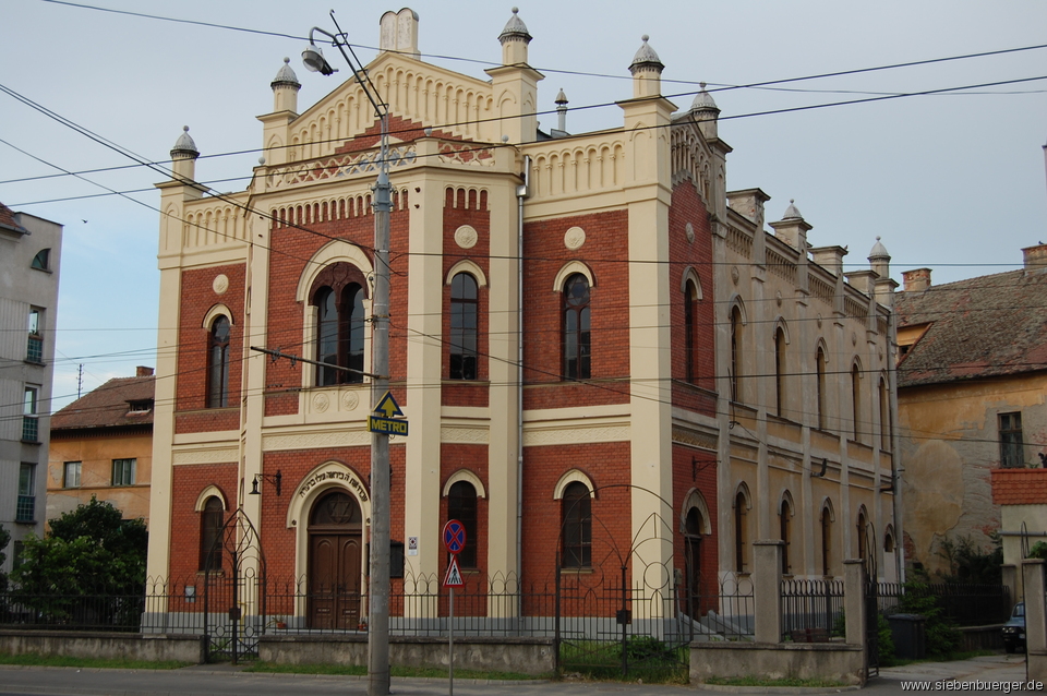 1898 erhält die jüdische Gemeinde Hermannstadts die zum Bau einer Synagoge notwendige Geldsumme. Der einteilige Bau mit rechteckigem Grundriss hat eine neugotische Fassade, in ihrem oberen Teil mit einem neuromanischen Fries aus Dreifachbögen geschmückt. Der Innenraum ähnelt einer Basilika; die Decke erinnert an die Neurenaissance. Die Thora-Nische an der Ostseite hat die Form einer halbkreisförmigen Apsis.