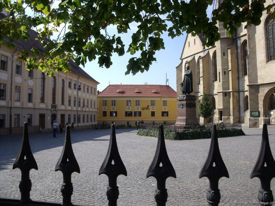 Der Huetplatz ist innerhalb der ersten Stadtbefestigung entstanden. Die Befestigungsmauer stammt vom Ende des 12. Jahrhunderts; das urkundlich belegte Bestehen der Hermannstädter Propstei im Jahr 1191 ist ein Terminus ante quem für die Datierung des heutigen Platzes und gleichzeitig auch die erste urkundliche Erwähnung von Hermannstadt. Die Häuser um den Huetplatz wurden auf die Wehrmauern gebaut, als deren Verteidigungsrolle mit der umfassenden Befestigung der Oberstadt beginnend mit der zweiten Hälfte des 14. Jahrhunderts überflüssig wurde. Die Bauten im Umkreis der evangelischen Kirche aus dem 15.-18. Jh. sind von bedeutendem kulturhistorischem Wert. Die wichtigsten sind das evangelische Stadtpfarrhaus, der Sagturm und das Brukenthal-Gymnasium.
