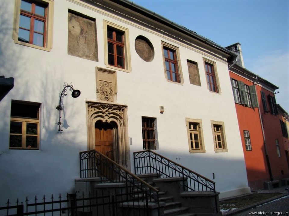Geprägt wird das Gebäude durch das steinerne Portal, das von Andreas Lapicida in gotischem Stil errichtet wurde. Ein Wappen oberhalb des Portals erwähnt den Pfarrer Johannes von Alzen als Spender und die Jahreszahl 1502. Das Portal umfasst im oberen Teil ein rechteckiges Wappen (ein sitzender Löwe mit einem aus einer Krone emporragenden Kreuz). In den vier Ecken bemerkt man die Porträts des Untertans, seines Schutzpatrons, des Hlg. Johannes des Täufers, des Kaisers FRIEDRICH und des Papstes ALEXANDER VI. BORGIA. Die obere Inschrift, ARMA JOHANNIS DE OLCZNA Q(VE) CESAR/ FRIEDERICUS DEDIT ADDIDIT CRUCEM/ HIERUSOLIMA SANCTA ALMA ROMA/ FIRMAVIT ANNO DOMINI 1502, ist von einem Profil eingerahmt, das die Renaissance ankündigt. Der gotische Türrahmen ist durch Formentiefe und die besondere Feinheit der floralen Motive gekennzeichnet.