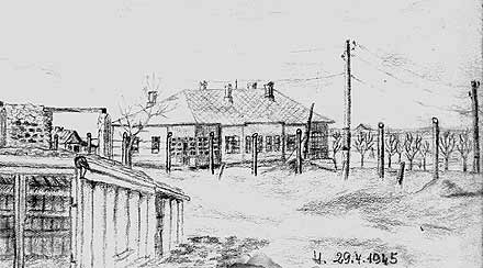 Ausblick aus dem Fenster meines Krankenreviers auf das Lager und die Grundschule Rajasnaja (Originalskizze) |