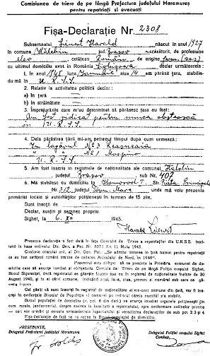 "Fisa-declaratie" (Erklärungsbogen) aufgenommen und ausgefolgt von der Repatriierungskommission für Deportierte und Evakuierte bei der Präfektur des Komitates Sighetul Marmatiei. |