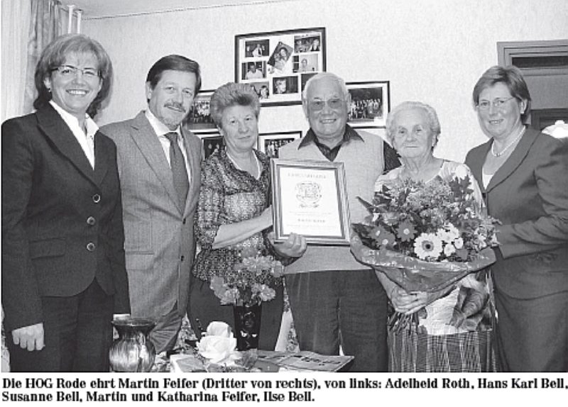 In der ersten Vorstandssitzung des neu gewählten Vorstands wurde die von Susanne Bell ausgearbeitete Satzung für die „Ehrenmitgliedschaft der HOG Rode“ angenommen und dem schriftlichen Antrag, Herrn Feifer zu ehren, zugestimmt. Martin Feifer war hocherfreut, als er von seiner Ehrung erfuhr. Er lud das Gremium zu sich nach Hause ein. Bei dem Treffen waren auch Tochter Gertrud mit Ehemann zugegen.