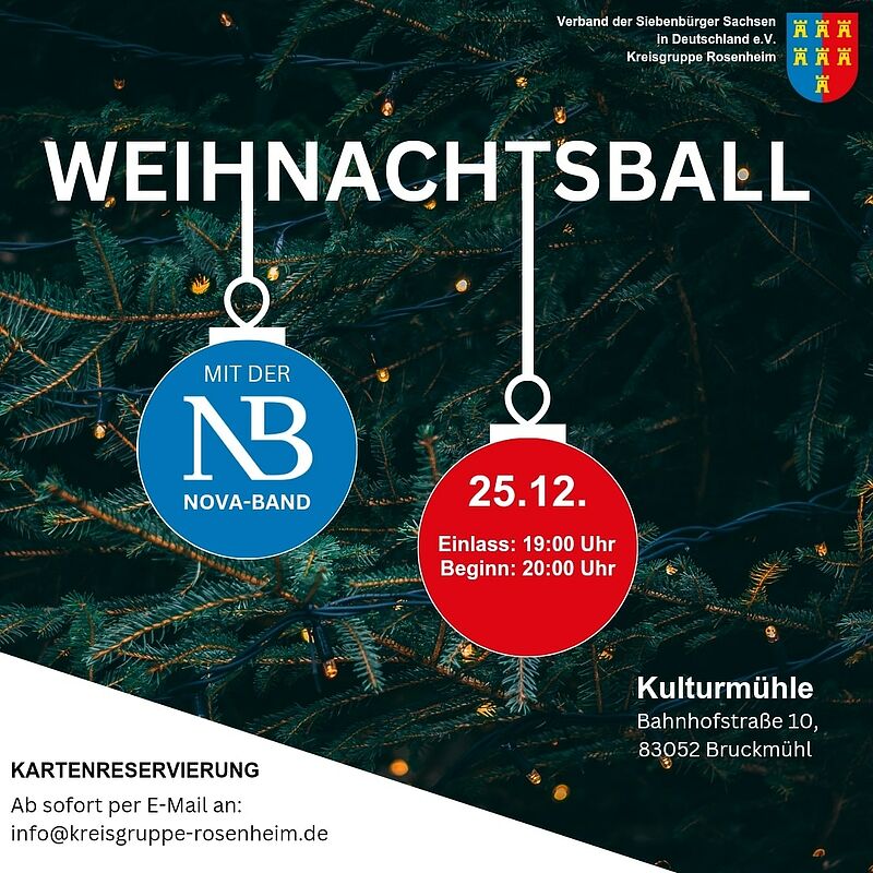 Die Kreisgruppe Rosenheim lädt ein zu ihrem ersten Weihnachtsball für Montag, den 25. Dezember, in die Kulturmühle Bruckmühl, Bahnhofstraße 10, in Bruckmühl.