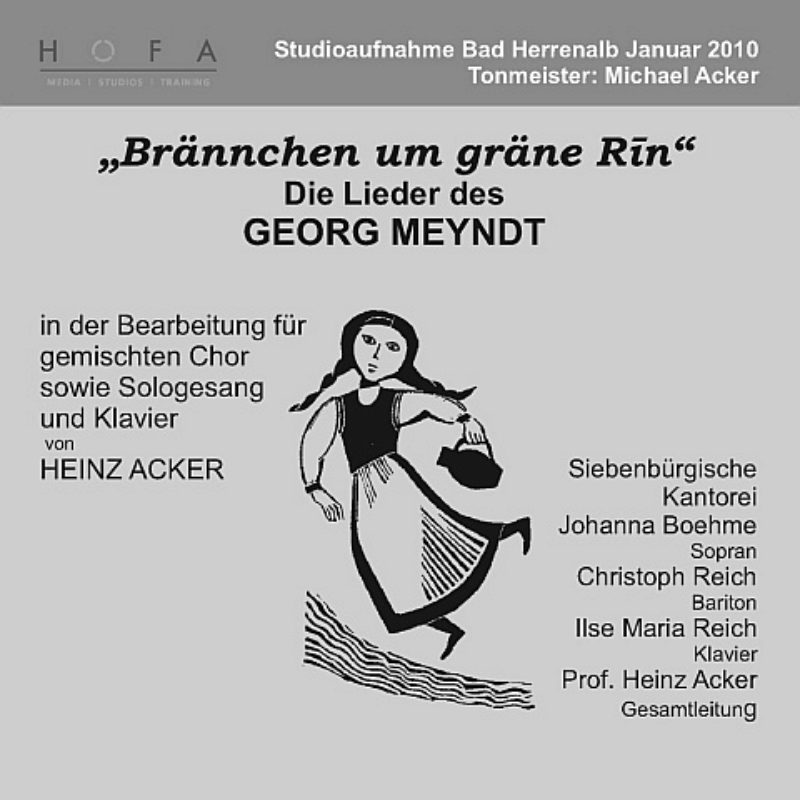 Die Siebenbürgische Kantorei hat Lieder von Georg Meyndt auf CD eingespielt. Vor zwei Jahren erschienen die volkstümlichen Mundartlieder des siebenbürgischen Dorfnotars, Volkssängers und Laienmusikers Georg Meyndt (1852-1903) in einer von Heinz Acker besorgten Neuausgabe im Johannis-Reeg-Verlag Heilbronn (siehe dazu SbZ-Online-Artikel: Georg Meyndt: "Kut, mer sängen int").