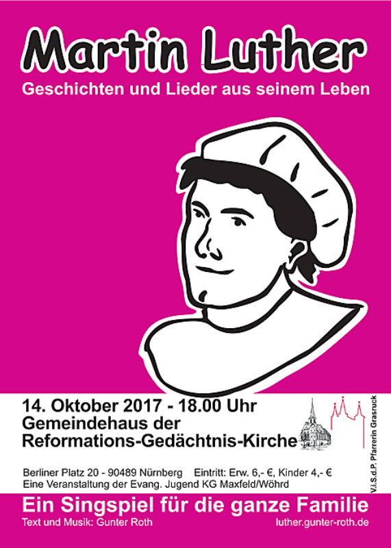 Am Samstag, dem 14. Oktober, wird im Gemeindesaal der Reformations-Gedächtnis-Kirche Nürnberg, Berliner Platz 20, Gunter Roths Singspiel „Martin Luther – Geschichten und Lieder aus seinem Leben“ aufgeführt.