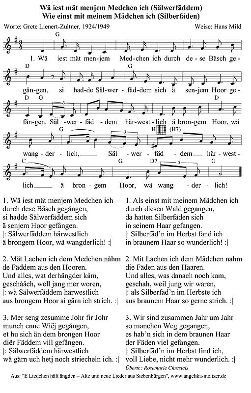 Liebe Leserinnen und Leser, heute stelle ich Ihnen wieder ein Lied vor, das in diesem Jahr seinen 100. Geburtstag feiert: „Sälwerfäddem“ (Wä iest mät menjem Medchen ich) von Grete Lienert-Zultner (1906–1989). Wie die meisten ihrer Lieder ist auch dieses Liebeslied tiefsinnig und feinfühlig sowie anschaulich und in der Vertonung von Hans Mild äußerst ansprechend.