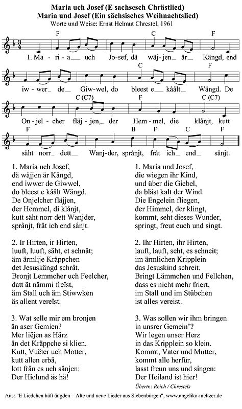 In Siebenbürgen war es Tradition, am Heiligen Abend in der Kirche ein Krippenspiel aufzuführen. In den dörflichen Gemeinden wurden sie gewöhnlich in dem jeweiligen Ortsdialekt einstudiert. Ein Weihnachtslied in sächsischer Mundart fehlte jedoch. Deshalb dichtete und komponierte Pfarrer Chrestel „E sachsesch Chrästlied“ (Maria uch Josef), das im Dezember 1961 beim Krippenspiel der Kantorenschule in Baaßen uraufgeführt wurde und in den folgenden Jahren dort zum festen Repertoire gehörte. Die vielen Kantorenschüler nahmen dieses Lied in ihre jeweiligen Gemeinden mit und sorgten somit für seine schnelle und weite Verbreitung. Auch heute noch erklingt dieses Lied traditionsgemäß auf den Weihnachtsfeiern unserer Landsleute. In die Liedersammlung „E Liedchen hälft ängden – alte und neue Lieder aus Siebenbürgen“ haben wir den dreistimmigen Satz von E. H. Chrestel übernommen. Bei Bedarf kann ich auch einen vierstimmigen Satz vom Autor liefern. Hören Sie das Weihnachtslied unter siebenbuerger.de/go/2L165 mit dem Zeidner Gesangstrio und einer Liveaufnahme von 2016 aus der Stadtkirche in Karlsruhe mit der Siebenbürgischen Kantorei. Sehr interessant wäre festzustellen, ob noch weitere Advents- oder Weihnachtslieder in Mundart bekannt sind. Wenn ja, bitte rufen Sie mich an: (0178) 7190141.