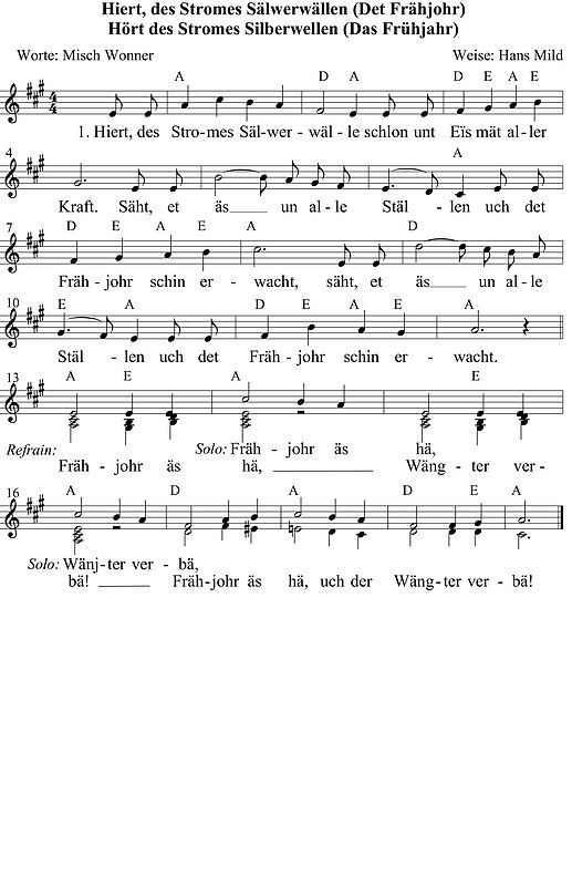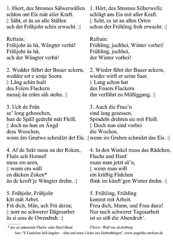 „Hiert des Stromes Sälwerwällen“ (Det Frähjohr) gehört zu den beliebtesten Frühlingsliedern. Viele siebenbürgische Chöre haben es in ihrem Repertoire. Dem Komponisten Hans Mild (1883-1958) ist mit der Soloeinlage im Refrain ein wunderbarer Griff gelungen, der sicher zur Beliebtheit dieses Lieds beigetragen hat. Der Ausruf des Tenor-Solisten im Refrain „Frähjohr äs hä! Wängter verbä!“ unterstreicht die Freude über die Ankunft der warmen Jahreszeit. Manch ein Tenor denkt auch heute noch stolz daran zurück, dass er einmal die Ehre hatte, diese Stelle solistisch zu singen.