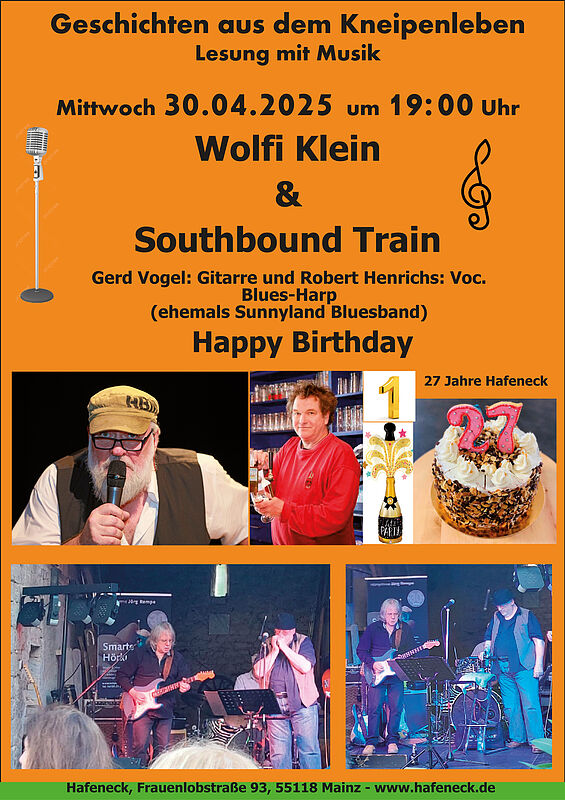 Am Mittwoch, 30. April, ab 19.00 Uhr wird im Hafeneck, Frauenlobstraße 93, 55118 Mainz (www.hafeneck.de) Geburtstag gefeiert: „27 Jahre Hafeneck“ begeht Wolfi Klein mit Gerd Vogel (Gitarre) und Robert Henrichs (Voc. Blues-Harp) als „Southbound Train“ und verspricht: „Da wird die Post abgehen. Kommt und überzeugt euch!“