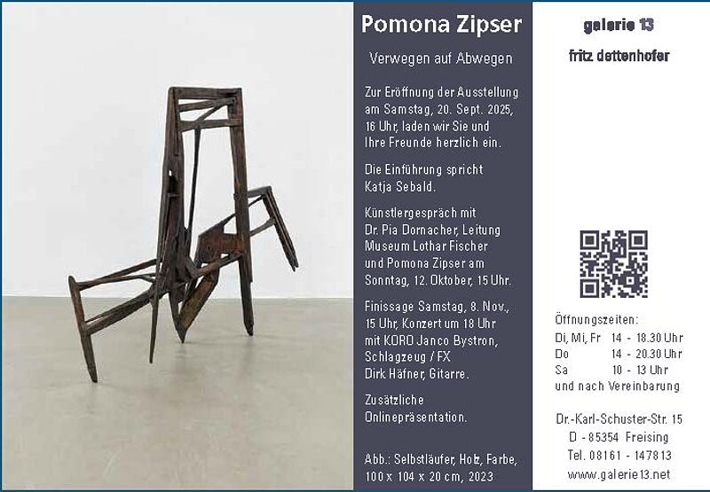 Am Samstag, 20. September, um 16.00 Uhr wird Pomona Zipsers Ausstellung „Verwegen auf Abwegen“ in der Freisinger Galerie 13 eröffnet. Die Einführung spricht Katja Sebald.