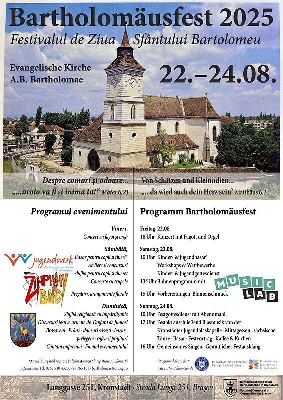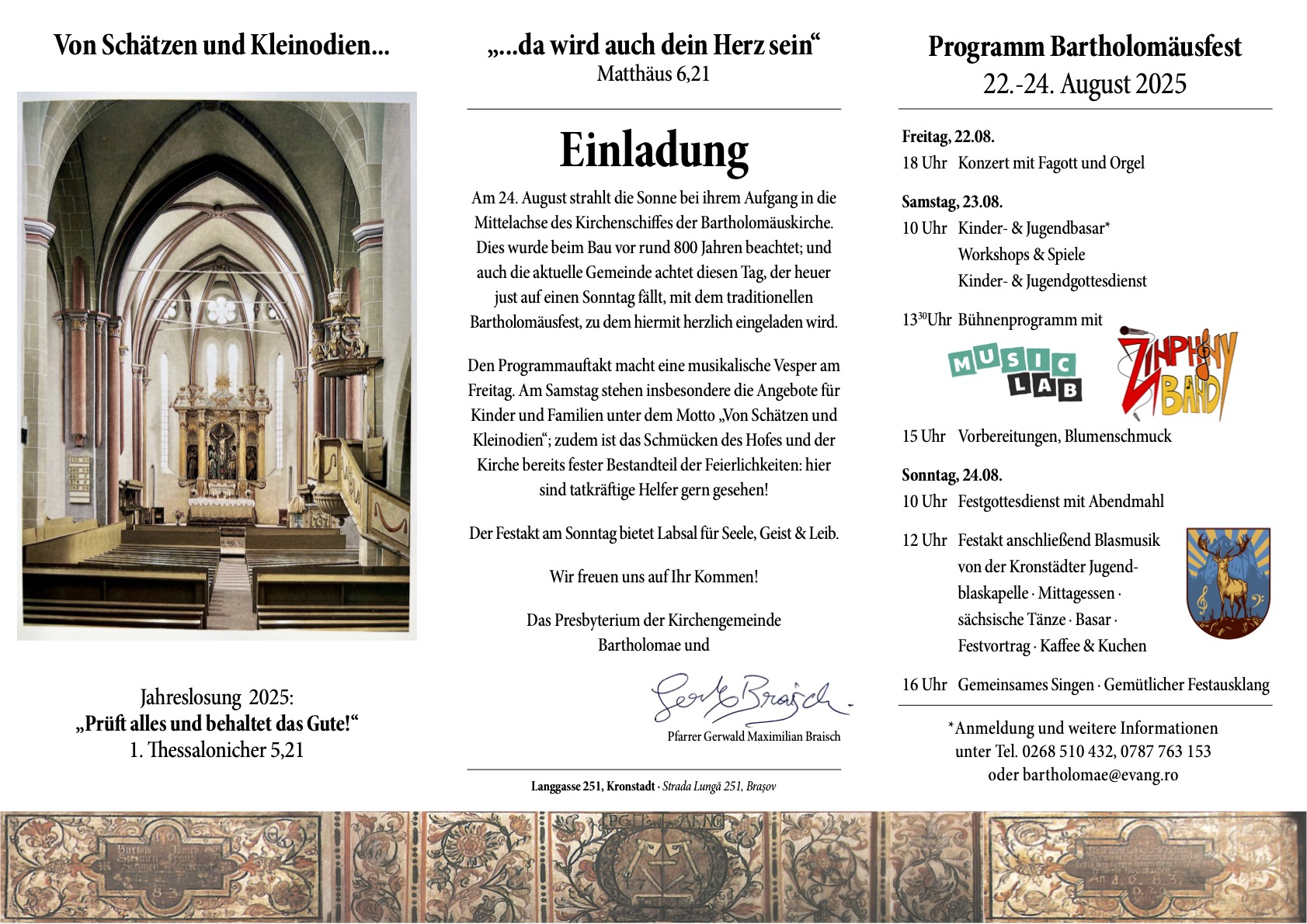 Das Presbyterium der evangelischen Kirchengemeinde Bartholomae und Pfarrer Gerwald Maximilian Braisch laden zum traditionellen Bartholomäusfest für den 22.-24. August 2025 in die evangelische Kirche Bartholomae, Langgasse 251 (strada Lungă 251) in Kronstadt (Brașov) ein.