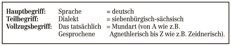 Diese verschiedenen (Orts-)Mundarten, die in Siebenbürgen gesprochen wurden bzw. gegenwärtig gesprochen werden, bilden zusammen den siebenbürgisch-sächsischen Dialekt, der ein westmittelfränkischer ist (ungefähr lokalisierbar im Rhein/Moselgebiet) und neben anderen Dialekten zur deutschen Sprachlandschaft gehört. Ich zitiere dazu Hanni Markel: „Wesentliche innere Kennzeichen weisen das Siebenbürgisch-Sächsische als einen zum Westmittelfränkischen gehörenden Dialekt der deutschen Sprache aus … Der Dialekt existiert … in lokalen Ausprägungen, den Mundarten, die ihrerseits mitunter nach Ortsteilen, ja sogar Gassen, nach sozialem Stand usw. Abweichungen voneinander aufweisen.“ (Sachsesch Wält. Mundart-Texte aus der Siebenbürgischen Zeitung. München 2010, S. 211) Ich versuche im Folgenden, das Gesagte durch eine optische Darstellung zu verdeutlichen, wobei das Zeichen = den eigenen Standort anzeigt: