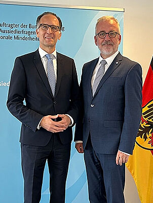 Am 6. Oktober traf sich der Beauftragte der Bundesregierung für Aussiedlerfragen und nationale Minderheiten, Dr. Bernd Fabritius, zu einem Gespräch mit dem Leiter der Zentralabteilung im Auswärtigen Amt, Dr. Peer Gebauer, ehemaliger deutscher Botschafter in Bukarest. Im Mittelpunkt des Austauschs stand die Umsetzung des Organisationserlasses des Bundeskanzlers vom 6. Mai 2025, mit dem die Zuständigkeit für die Förderung der deutschen Minderheiten aus dem Auswärtigen Amt (AA) in das Bundesministerium des Innern (BMI) übergeht. mehr...