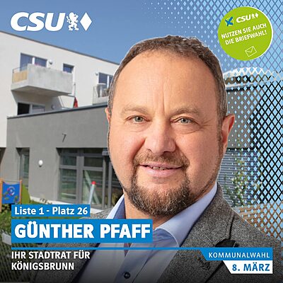 Günther Pfaff kandidiert für die CSU auf Liste 1, Platz 26 für den Königsbrunner Stadtrat. Der 58-jährige Siebenbürger Sachse (verheiratet, drei Kinder, evangelisch) stammt aus Petersdorf bei Mühlbach und lebt seit 30 Jahren in Königsbrunn bei Augsburg. Pfaff führt einen Familienbetrieb für Sicherheitstechnik und Schlüsseldienst. mehr...