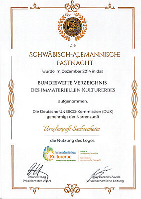 Die Urzelnzunft Sachsenheim e.V. ist ein bedeutender Träger der schwäbisch-alemannischen Fasnet und damit Teil eines traditionsreichen Brauchtums, das seit Dezember 2014 im bundesweiten UNESCO-Verzeichnis des immateriellen Kulturerbes geführt wird. Diese Anerkennung würdigt die kulturelle Bedeutung der Fasnet als lebendige Tradition, die über Generationen hinweg weitergegeben wird und eine wichtige Rolle für die regionale Identität spielt. Für die Urzelnzunft Sachsenheim e.V. bedeutet diese Auszeichnung vor allem Verantwortung: das überlieferte Brauchtum authentisch zu bewahren, seine Regeln zu respektieren und Masken, Häser sowie traditionelle Abläufe unverfälscht an die kommenden Generationen weiterzugeben. mehr...