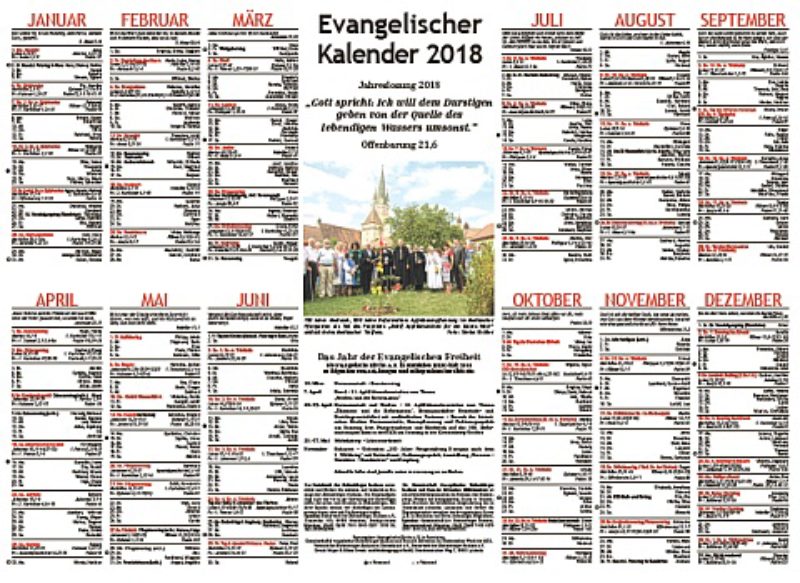 Der evangelische Wandkalender 2018 wurde in der Siebenbürgischen Zeitung, Folge 20 vom 20. Dezember 2017 – wie in den letzten Jahren – auf Zeitungspapier veröffentlicht. Der Kalender ist auch auf Hochglanzpapier gegen eine geringe Gebühr bei Pfarrer Dr. Stefan Cosoroabă erhältlich. Als kleines Weihnachtsgeschenk können alle Leser der Siebenbürgischen Zeitung Online den Kalender als pdf-Datei in hoher Auflösung herunterladen und ausdrucken (den Link finden Sie in diesem Artikel).