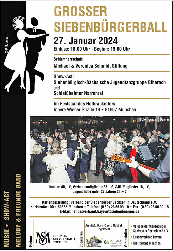Endlich ist es wieder so weit, die traditionelle Ballsaison steht vor der Tür! Wir möchten Sie recht herzlich einladen, diese mit uns auf dem Großen Siebenbürgerball am 27. Januar 2024 im Hofbräukeller München zu eröffnen!