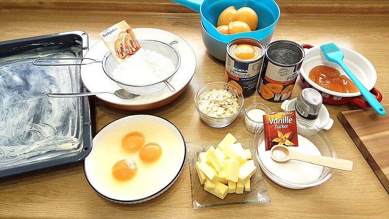 Zubereitung: Aprikosen auf einem Sieb abtropfen lassen. Backblech (ca. 40 x 30 cm) gut einfetten (mit weicher Butter schmeckt es noch besser). Backofen auf 180°C Ober- Unterhitze vorheizen.