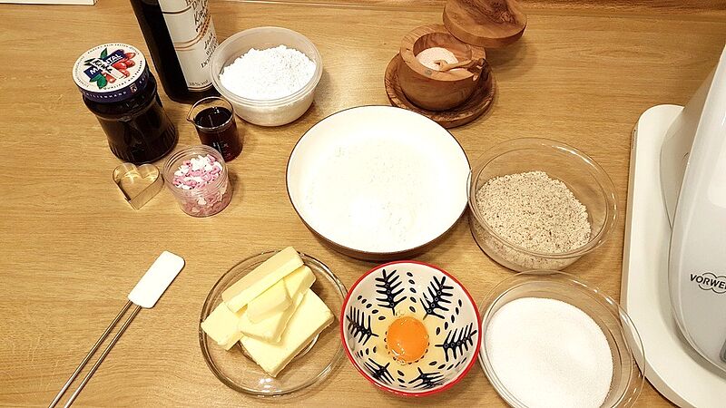 Zubereitung: Aus den gesamten Zutaten einen Mürbteig zubereiten (im TM 25 Sek Stufe 7). Den Teig in eine Folie packen, etwas flachdrücken und für mindestens 2 Stunden kalt stellen. Den Teig danach kurz geschmeidig von Hand kneten, ausrollen und Herzen ausstechen. Diese auf ein vorbereitetes Backblech geben. Bei 180°C Ober-/Unterhitze im vorgeheizten Backofen etwa 10 Minuten backen.