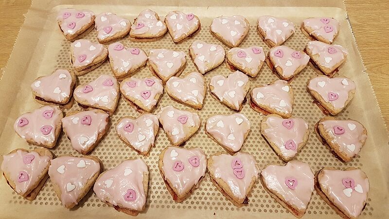 Nach dem Erkalten immer zwei Herzen mit Kirschkonfitüre zusammenkleben.