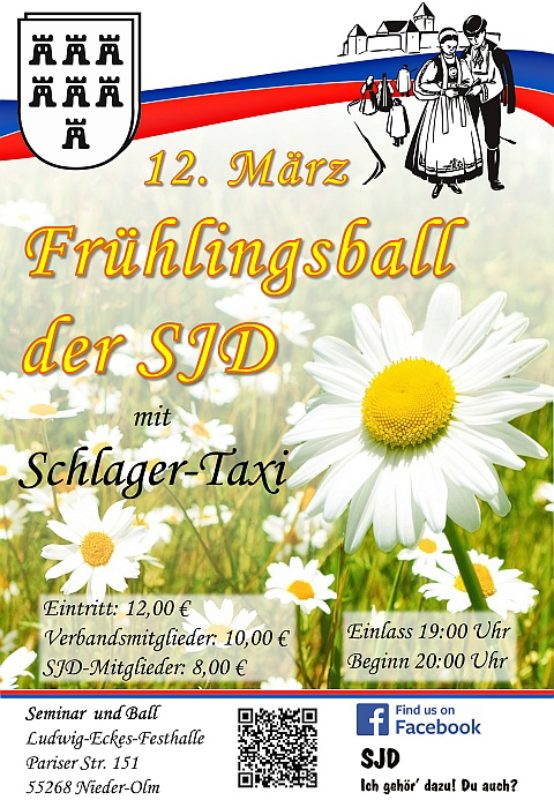 Anlässlich ihres Vorbereitungsseminars für den Heimattag (siehe Ankündigung in der Siebenbürgischen Zeitung) veranstaltet die Siebenbürgisch-Sächsische Jugend in Deutschland (SJD) ihren der Frühlingsball am 12. März, ab 20.00 Uhr, in der Ludwig-Eckes-Halle, Pariser Straße 151, 55268 Nieder-Olm. Die Musikband „Schlager-Taxi" spielt zum Tanz auf.